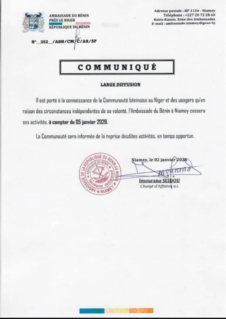 Alors qu’on pensait que l’affaire allait s’en arrêter là, afin que les deux pays trouvent un terrain pour une entente, Cotonou choisit de répondre aussi. Et qui va porter le message au public et aux autorités du Niger ? Celui-là même que le ministère des affaires étrangères du Niger a expulsé. Imourana Seidou a signé un dans lequel il informe, au nom de l’ambassade du Bénin à Niamey, que la représentation béninoise va suspendre ses activités à compter du 5 janvier 2026. La note a servi l’information dans un langage diplomatique, avançant que cette décision est suscitée par « des circonstances indépendantes de sa volonté », sans autres précisions. La communauté béninoise sera donc informée « en temps opportun » d’une éventuelle reprise des activités.