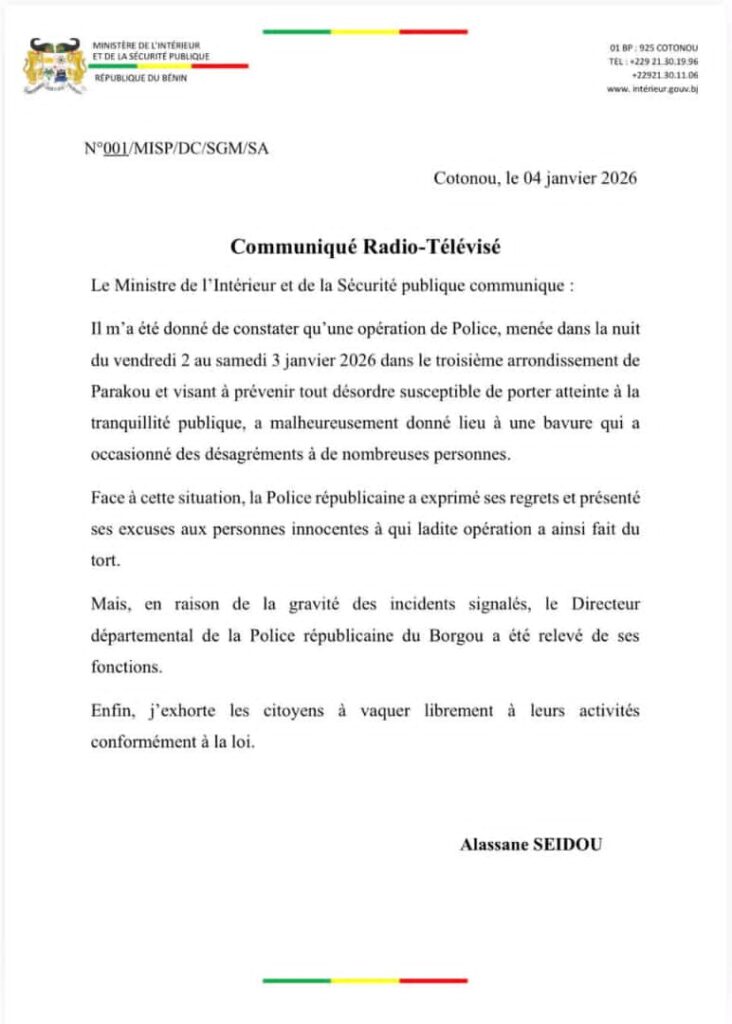 Les choses sont allées très vite : une remontée de l’information et la hiérarchie qui a pris ses responsabilités. Baudelaire Ségoh a vu son fauteuil remis à quelqu’un d’autre à la tête du département du Borgou pour poursuivre l’oeuvre de construction de la sécurité publique.