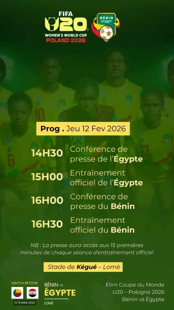 Après le hold-up parfait réalisé au Caire (1-0), nos Amazones U20 ne sont plus qu’à 90 minutes d’un exploit qui ferait date. Mais attention : une Pharaonne blessée reste un prédateur redoutable.Le duel des mots avant celui des cramponsTout commence dès 14h30. Le staff égyptien ouvrira le bal face aux micros. On s’attend à un discours conquérant, car pour elles, l’échec n’est pas une option. Dans la foulée, à 15h00, les joueuses égyptiennes fouleront la pelouse pour une ultime reconnaissance. Leurs 15 premières minutes de jongles et de sprints seront scrutées de près par les observateurs : l’ombre d’un doute ou une détermination de fer ? Puis, place à nos héroïnes. À 16h00, le sélectionneur béninois prendra la parole. Calme, déterminé, il devra répondre à la question qui brûle toutes les lèvres : comment verrouiller cette qualification sans trembler ?