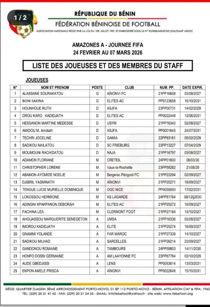 Pour ce rendez-vous historique, le staff béninois a convoqué 25 joueuses issues du championnat local et de clubs européens. On y retrouve des cadres comme Marguerite Ahouassou (UMSA), la dynamique Tengue Lucie (OGC Nice) ou encore Aude Gbédjissi (Lens). Une ossature qui mêle jeunesse, vécu international et ambition.