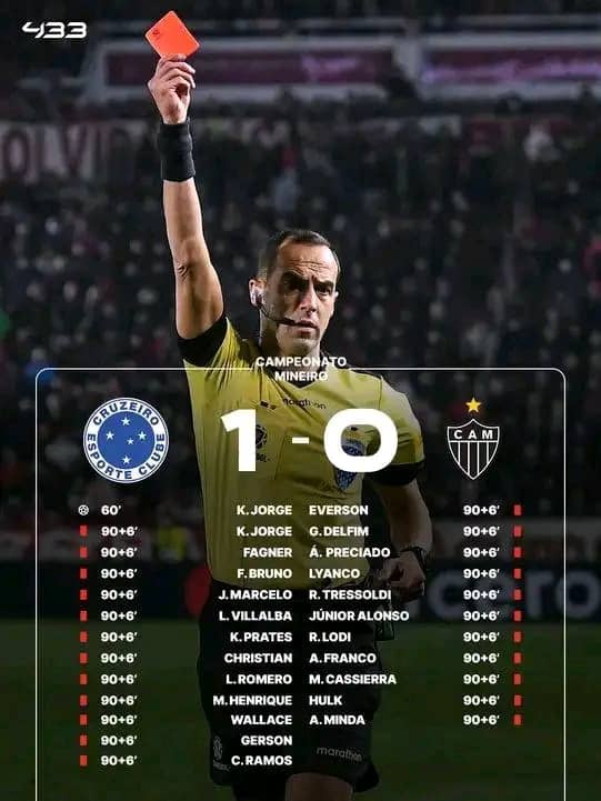 Le football brésilien a vécu une soirée totalement surréaliste. La finale du championnat de l’État du Minas Gerais, le Campeonato Mineiro, entre Cruzeiro Esporte Clube et Clube Atlético Mineiro, s’est transformée en véritable scène de chaos avec 23 cartons rouges distribués, un record inédit dans l’histoire du football au Brésil.