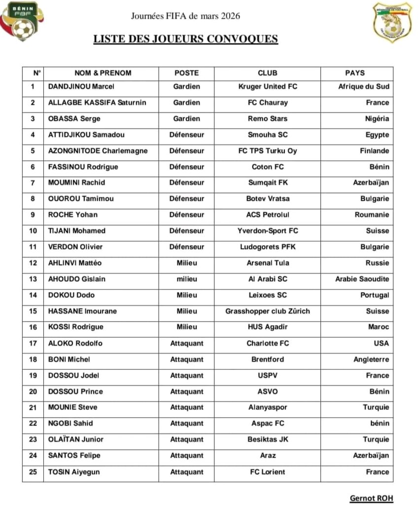 A l’approche de la fenêtre internationale de mars, le sélectionneur des Équipe du Bénin de football, Gernot Rohr, a dévoilé la liste des joueurs retenus pour les deux matchs amicaux prévus face à la Équipe de Palestine de football et à la Équipe de Guinée de football.Pour ces rencontres de préparation inscrites dans la fenêtre officielle de la FIFA, 25 joueurs ont été convoqués. Une sélection qui mêle cadres habituels et nouveaux visages, avec deux joueurs appelés pour la première fois sous les couleurs nationales.