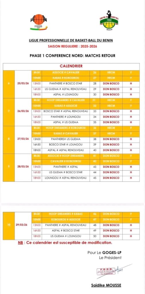 Le Nord entre à son tour dans la danse. Après la montée en régime observée dans la Conférence Sud, la Conférence Nord de la Ligue professionnelle de basketball du Bénin s’apprête à vivre une séquence déterminante avec les matchs retour de la phase 1. Du 25 au 29 mars 2026, les regards seront tournés vers Parakou, entre le parquet de l’HECM et celui du centre Don Bosco, théâtres d’une bataille sportive qui s’annonce intense.