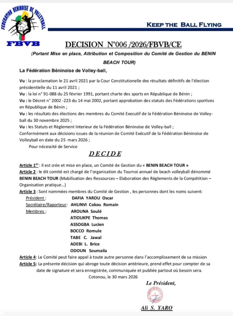C’est à travers la Décision N°006/2026/FBVB/CE que le président Ali S. Yaro a officialisé la création de ce comité stratégique. Une initiative qui s’inscrit dans une dynamique de modernisation du volleyball béninois, avec un accent particulier sur le développement du beach-volley. L’objectif est clair : donner une nouvelle dimension au Benin Beach Tour, tant sur le plan organisationnel que sportif.