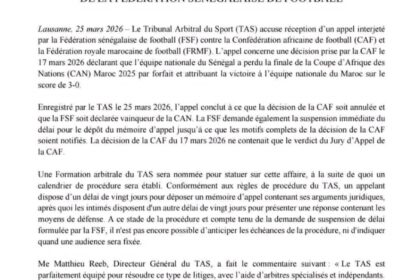 .Nouveau rebondissement dans l’affaire qui secoue le football africain. Le Tribunal Arbitral du Sport (TAS) a officiellement été saisi par la Fédération Sénégalaise de Football contre la Confédération...